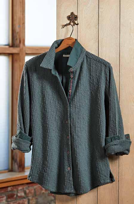 PALMA TOP Cool and finely textured, this is the shirt to usher in warmer temps. Featuring flattering, peasant top-inspired details like a split v-neck and shirring around the collar, it’s one of those instant go-to’s. Trapunto stitching at the neckline and cuffs. Side vents. 100% cotton. Imported in Sage or Apricot. Women’s sizes: XS-XL. [333147] $8 9