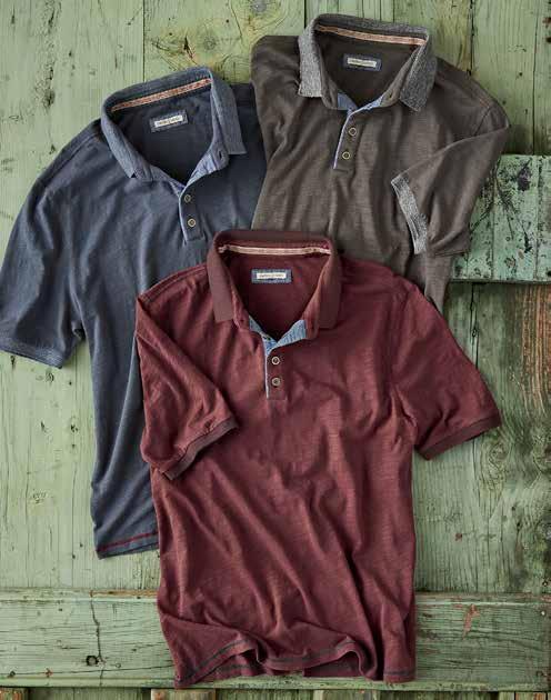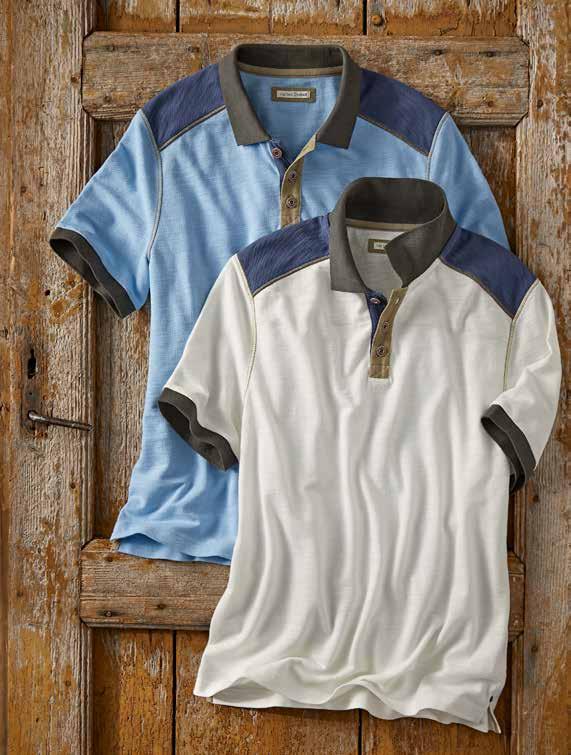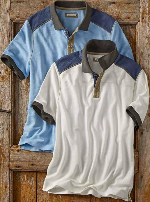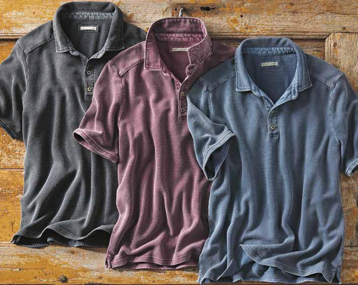 We love this polo’s unique texture (like an exaggerated pique). It also has a soft, surprisingly lightweight feel. Washed down for a sun-fade finish, it has a dropped shoulder seam with fine woven trim for interest. Fine woven twill at inner collar and inner placket trim. Side vents. 100% cotton. Imported in Carbon, Merlot or Ice Blue. Men’s sizes: S-XXL. [144561] $79