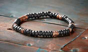 Copper Route Bracelet Composed of matte black wood beads and antiqued copper disks strung on a stretchy elastic cord, this bracelet evokes worldly found objects. Easily stacks up with other bracelets for an earthy, rustic look. Imported in Black Copper. One size fits most. 8". [188024] $24