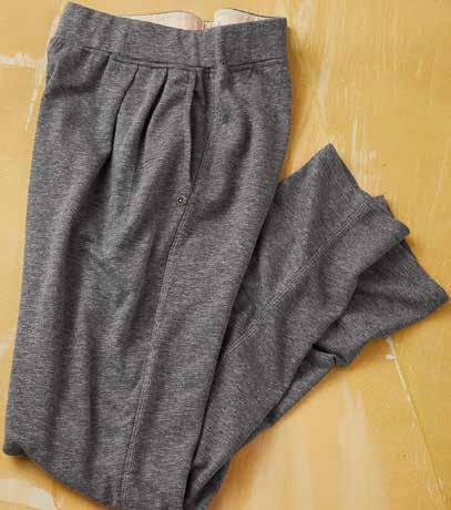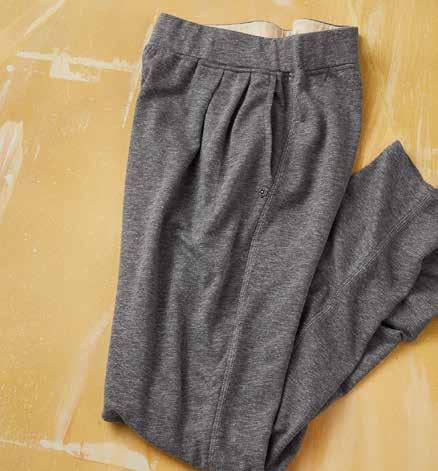 TEMPO PANTS Super soft and lightweight, these are the knit pants to take you into the warmer months. Made of marled French Terry, they have flattering front pleats to drape slightly away from the body. Jersey-lined inner elastic waistband. Front pockets with a single rivet trim. Easy tapered leg. 50% poly, 40% cotton, 10% rayon body. Imported in Charcoal. Women’s sizes: XS-XL. [328021] $8 9