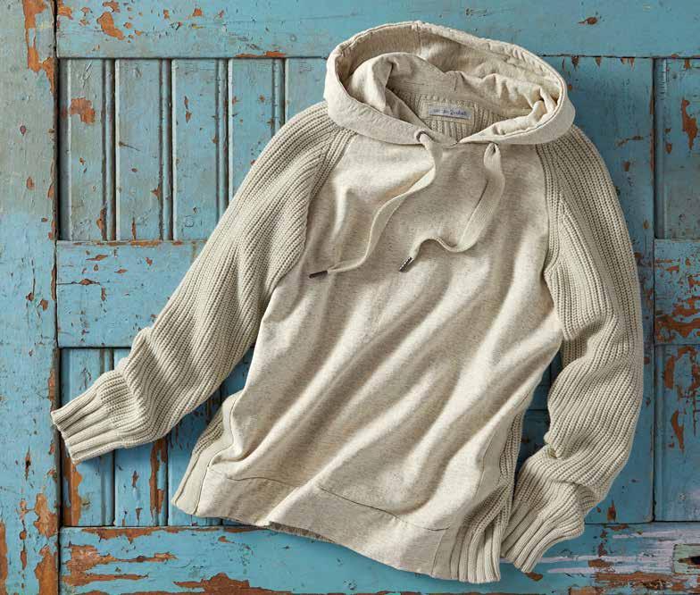 POSTGRAD SWEATER Sweater, meet sweatshirt. Combining a velvety-soft heather jersey front and hood, plus shaker knit sleeves and back body, you get lots of textural, tonal contrasts, and a cozy feel. A thick drawcord adds to the elevated look. Rib knit trim at the back banded hem and cuffs. 95% cotton, 5% spandex. Imported in Oat. Women’s sizes: XS-XL. [355097] $ 129
