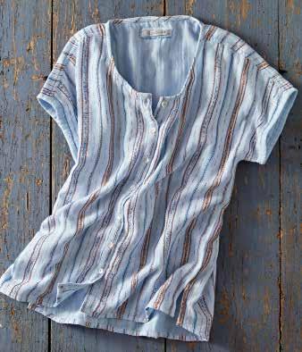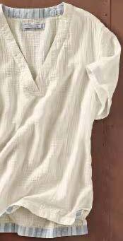 PALMA TOP Cool and finely textured, this is the shirt to usher in warmer temps. Featuring flattering, peasant top-inspired details like a split v-neck and shirring around the collar, it’s one of those instant go-to’s. Trapunto stitching at the neckline and cuffs. Side vents. 100% cotton. Imported in Sage or Apricot. Women’s sizes: XS-XL. [ 333147 ] $8 9