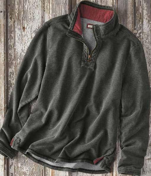 Cool details to spare in this pu over. Made of lightweight French terry with a super ne, rib-knit look and feel, the dye is ro ed onto the outside to create the handsome, charcoal gray coloration and the pop of red along the inside of the co ar. Washed to a denim-like fade, it has an open bo om hem and side vents. 95% co on, 5% spandex. Imported in Coal. [ 144399 ]