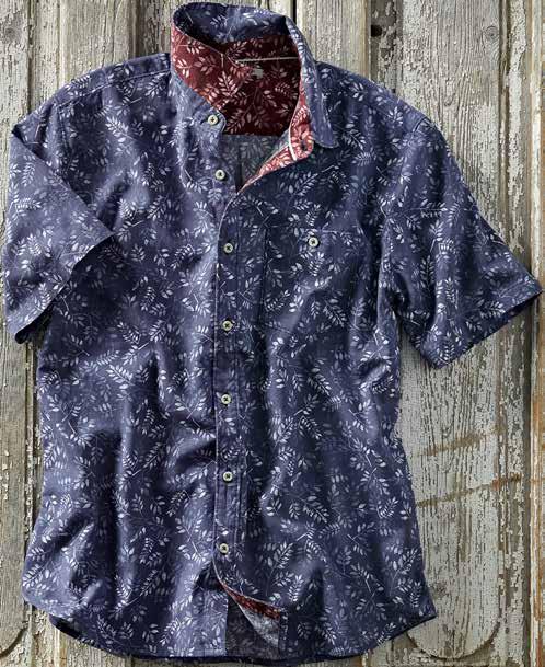 SHADED SHIRT Made of lightweight indigo chambray, this short-sleeve has a vintage woodblock-inspired print in muted blues to evoke a tree-shaded garden. Cool and breezy in both looks and feel. Contrast herringbone tape trim at the inner button placket. 100% cotton. Imported in Chambray. Men’s sizes: S-XXL. [133808] $89