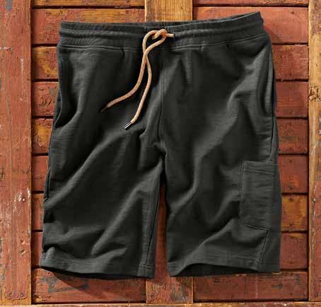 Whether you’re working hard or hardly working, these shorts combine sweats-level comfort with cargo function. Soft draping in a substantial French terry, they feature woven fabric flap cargo pockets, a hammer loop (stash your sunglasses instead) and two back pockets. Elastic waist with interior drawcord. Zip fly. 100% cotton. 10" inseam. Imported in Navy or Olive. Men’s sizes: S-XXL [128080] $89