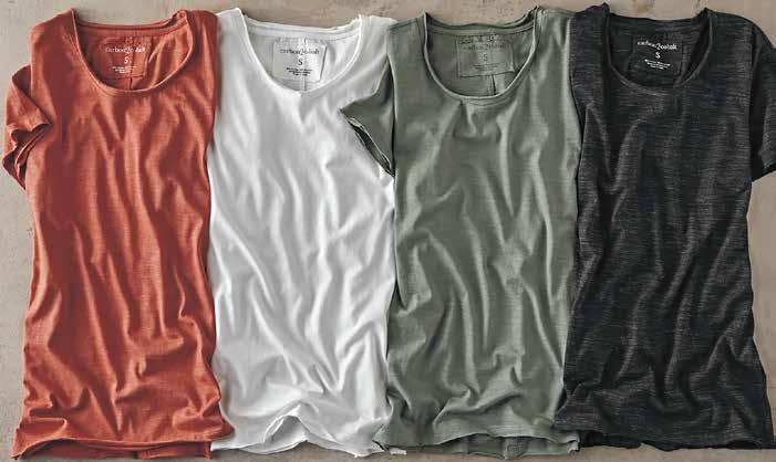 Super soft, lightweight, and breathable — meet your new essential tee. Made of a cotton-blend slub jersey, the fabric is slightly heathered for a better-than-basic look. 90% cotton, 10% poly. Imported in Terracotta, White, Sage or Black. Women’s sizes: XS-XL. [344070] $4 9