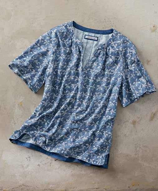 Inspired by antique florals, this silky-soft, featherweight tunic is perfect for days when you want something cool-wearing with coverage. Thoroughly romantic-yetsophisticated, it flatters with its easy, flowing fit and features a v-neckline punctuated with pops of coral thread. 55% cotton, 45% modal. Imported in Multi. Women’s Sizes: XS-XL. [333106] $ 89