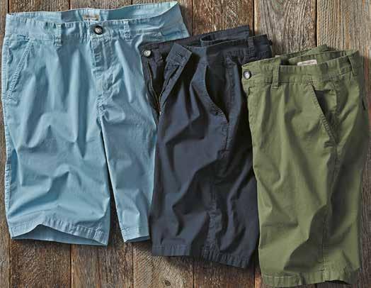 Made of smooth cotton with a touch of stretch, these versatile everyday shorts have a soft, slightly peached hand and a durable up-foranything design. Features include a clean flat-front with slash pockets and two hidden snap flap back pockets. Zip fly. 10“ inseam. 98% cotton, 2% elastane. Imported in Light Blue, Navy or Olive. Men’s Sizes: 30-40 (even) also 33 and 35. [122084] $79