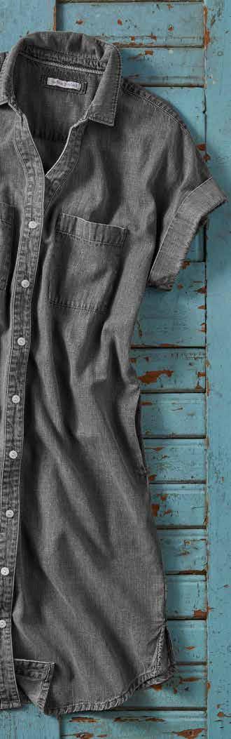 Stonewashed to the perfect fade, this is the denim dress, C2C-style. Medium-lightweight fabric is multi-season wearable — wear now with sandals and later with boots. Features flattering dolman sleeves and a v-neck with faux shell button front. Patch chest pockets. Curved hem. 100% cotton. Imported in Charcoal. Women’s sizes: XS-XL. [366006] $ 99