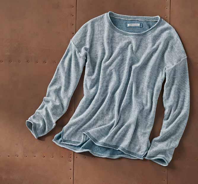 In sun-washed sky blue, this lightweight, reverse jersey sweater is just substantial enough to ward off the errant chill. With a refined feel, it has rib-knit and rolled trim, and reversed out seams to add textural interest.