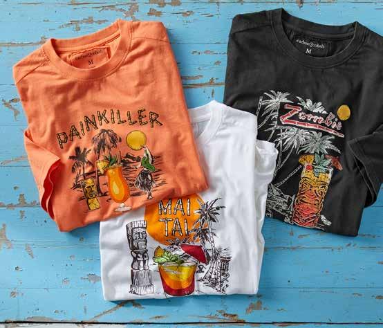 Warmer weather means outdoor happy hours and tiki lounge cocktails. Made of seriously soft combed cotton with an old favorite feel, these tees feature hand-drawn artwork celebrating some of our favorite classics. Crew neck. 100% cotton. Imported. Choose from: Orange (Painkiller), (Zombie) or White (Mai Tai)