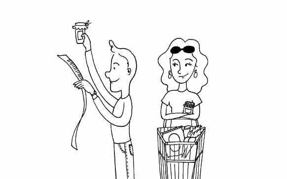 Já no supermercado, João, de olho em sua lista, apanha um pote de requeijão. Maria segura sua mão.