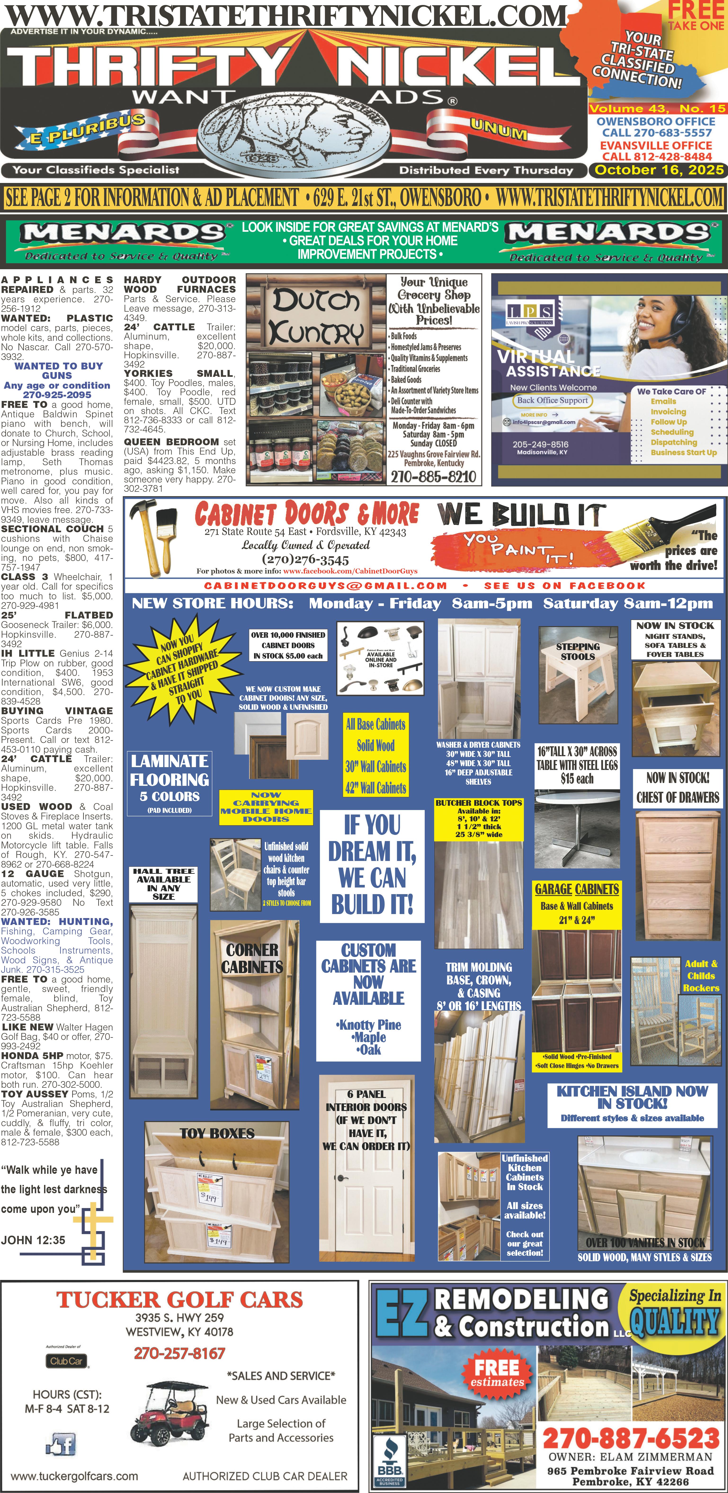 USED WOOD & Coal Stoves & Fireplace Inserts. 1200 GL metal water tank on skids. Hydraulic Motorcycle lift table. Falls of Rough, KY. 270-5478962 or 270-668-8224 STORAGE CABINETS Great for linens, utility rooms, garages & more! Come see our selection at Cabinet Doors & More, LLC., Hwy 54 in Fordsville. 270-276-3545. COLD A/C in your vehicle? If not, we can help! Call Moore’s Auto Electric 270-240-1343. WANT RESULTS? Call your Thrifty Nickel today & place a classified ad for only $20 for 15 words, for 4 weeks! Call today, 270683-5557 or 812-4288484.