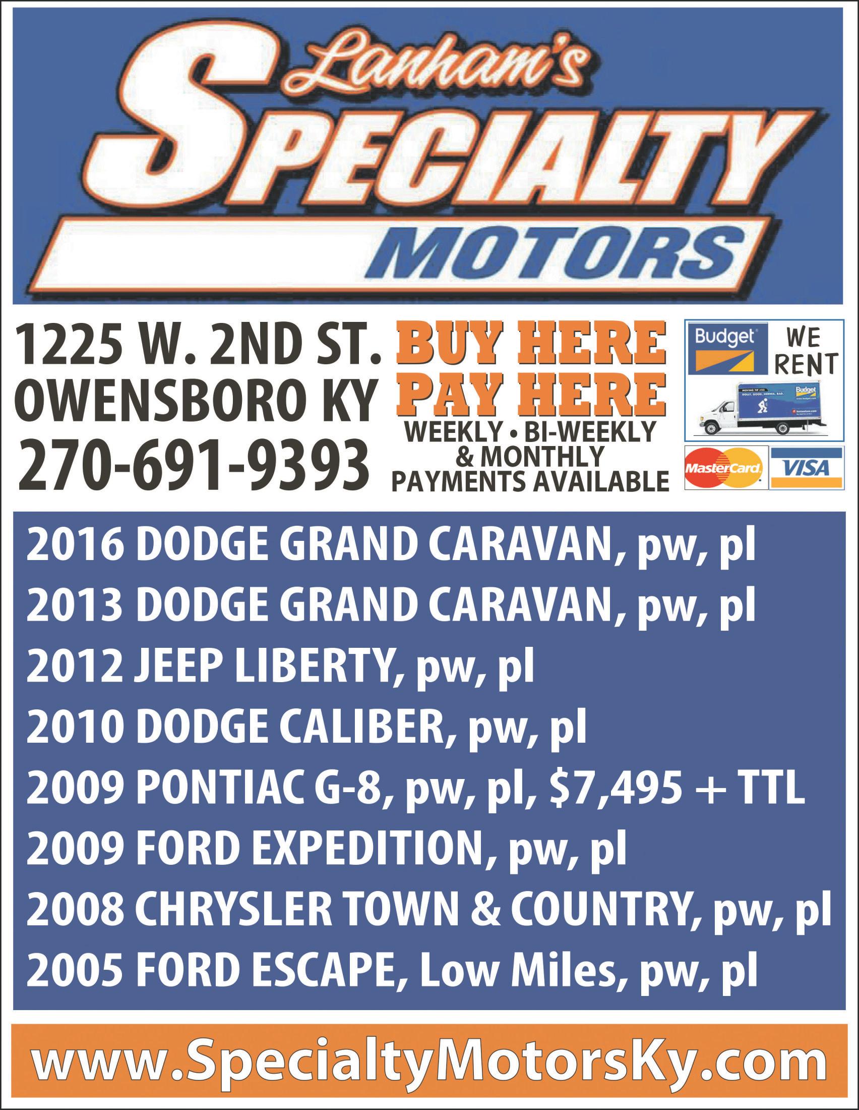 WE STOCK a wide variety of mouldings. Base, Casing, Crown, & more. Clear or Primed. Builders Discount on Hwy. 54. 270926-4200. LIFT KITS , Wheels, Tires. Lanham Offroad Accessories, 270-2318155. EZ AUTO SALES & PARTS, 1008 Omega St., Owensboro. We buy any cars, new after-market Parts, used parts, Tires. Auto repair available. 270541-1950. TREE SERVICE Young’s Tree Service, Trimming or Removal with bucket truck or crane, will reach 100 ft. Also stump removal. Reasonable. Licensed & Insured. Free Estimates. Also firewood available! 270-929-4277 or 270-7714159. GUNS & AMMO IN STOCK. E-Z Money Pawn, 270-925-2095