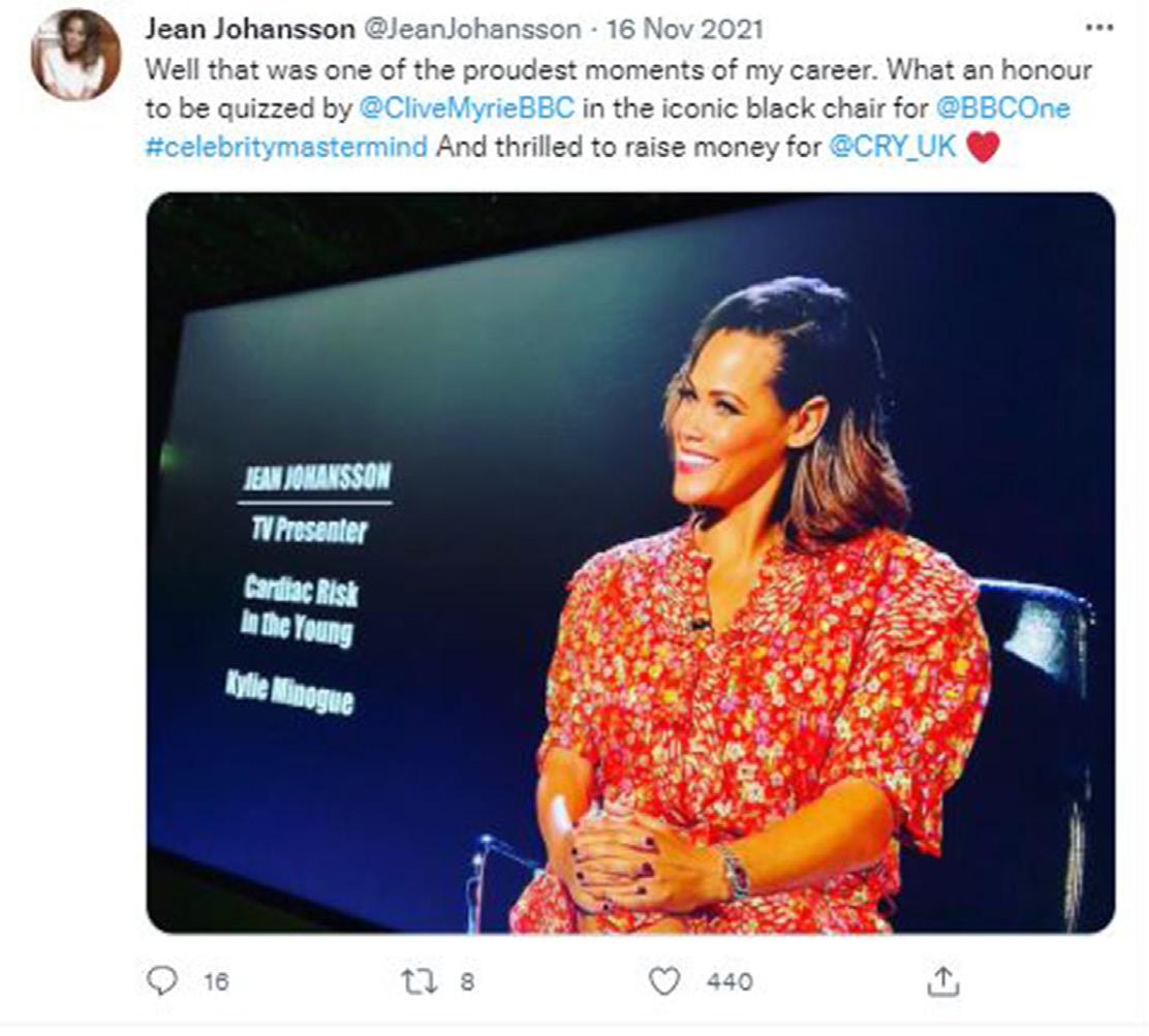 We are always grateful for those with large platforms, such as CRY’s own Patrons and Ambassadors, for using their reach to bring awareness to young sudden cardiac death and the importance of CRY’s work. In November, Jean Johansson, TV presenter of shows such as A Place in the Sun, competed on Celebrity Mastermind and selected CRY as her charity to support in her episode.