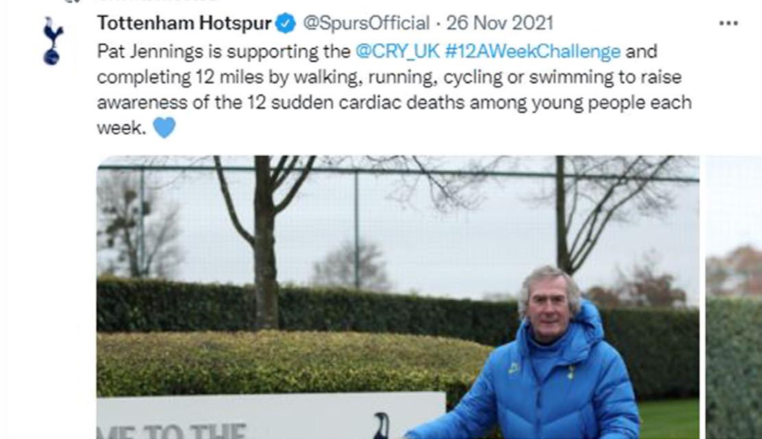 One of our Twitter highlights in Raising Awareness Week came from CRY Patron Pat Jennings, who offered his support by taking part in the CRY 12 A Week Challenge. Pat, who spent 13 years of his career playing for Tottenham Hotspur, got some support from his former club. The official Spurs Twitter account shared word of Pat’s efforts, as well as a link to CRY’s website where people could find out more about the charity and our 2021 Raising Awareness Week. This was a fantastic way to raise awareness, and thank you to Pat and all our supporters who got involved in the 12 A Week Challenge!
