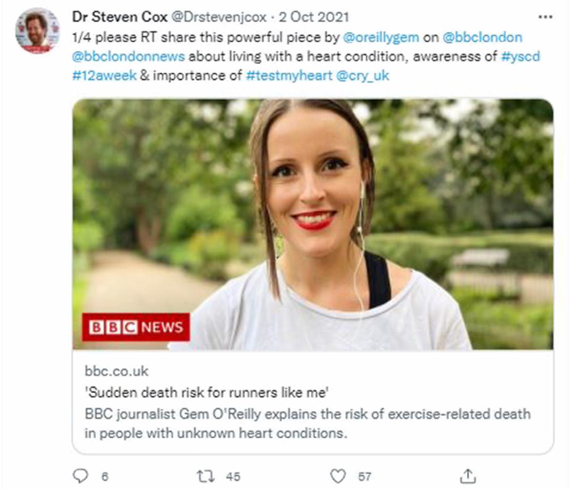 Gem O’Reilly from the BBC was diagnosed with a heart condition was she was 16 years old, which has since changed her life in many ways. Gem’s article about her story and young sudden cardiac death received plenty of engagement on social media, and the story was also featured on TV on BBC London to help draw even more attention to her story and CRY’s work.