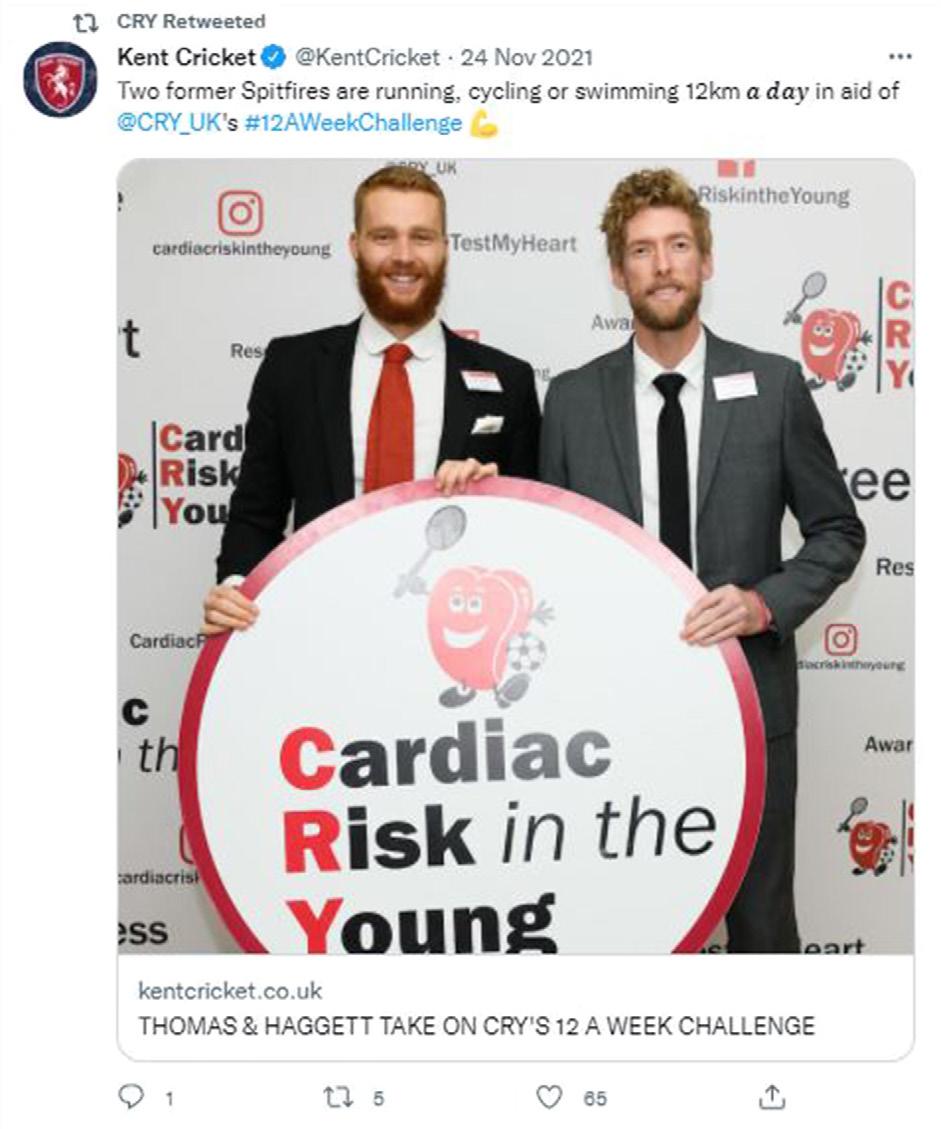 Social media is a vital part of how CRY interacts with supporters and, first and foremost, raises awareness of young sudden cardiac death and what can be done to tackle it – from preventative measures (screening) to bereavement support for those affected by a tragedy. In the CRY Online segment, we look back at the fourmonth period the Update covers and include a small selection of social media highlights, such as Facebook posts that reached an amazing amount of people, or supporters who tweeted memorable photos at us.