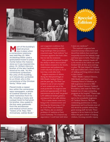uch of the building’s steel structure was in place when a cornerstone ceremony was held May 23, 1954. Archbishop Ritter used a gold-plated trowel to place mortar below the massive stone as it was lowered into place. Dr. William Glennon, brother of the late Cardinal, stood at his side. “As this cornerstone symbolizes the unity of this building, so it should also symbolize to us Christ, who is the cornerstone of the Christian family,” Ritter said. Placed inside a copper box within the cornerstone were newspapers, a photo of Cardinal Glennon and other mementos from his life, including a rosary and a prayer book he had given his brother. Also sealed in the box were yearbooks from the archdiocese and medical school and a “Sisters of St. Mary 75th Anniversary Jubilee Book.”