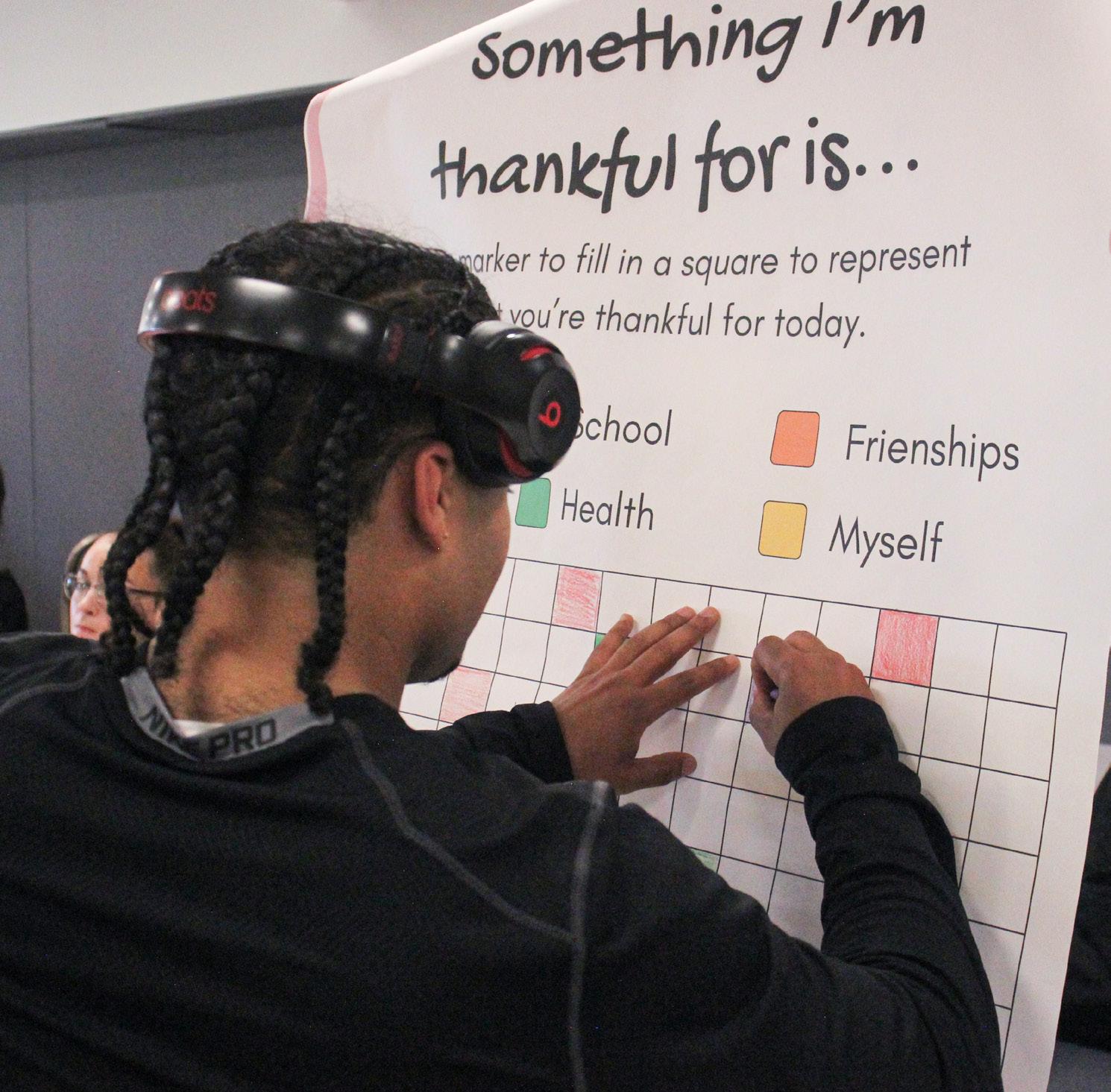 Several of the exercises at “Strong Start” were aimed at mindfulness. A student colors a square to symbolize something he is thankful for at the event Sept. 10.