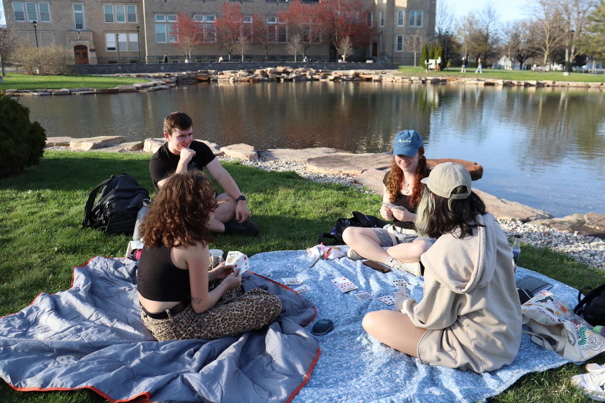 A group of friends plays a card game on a picnic blanket by Hawkins Pond in the Spring semester.