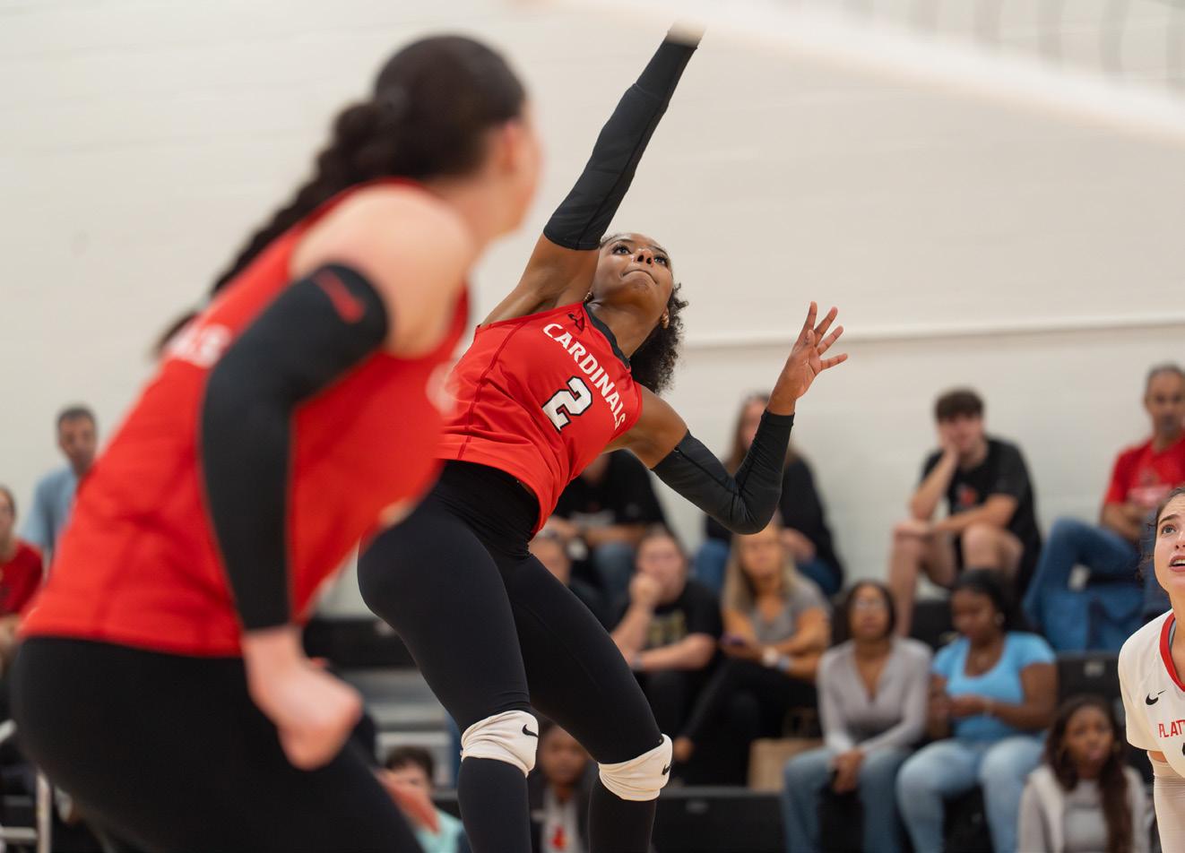 The Cardinals held their own against pressure from the first serve to the last point, despite meeting a brick wall at the finish. The final scores 25–22, 25–13, and 25–12 don’t adequately reflect the battle the Cardinals put up, particularly early.
