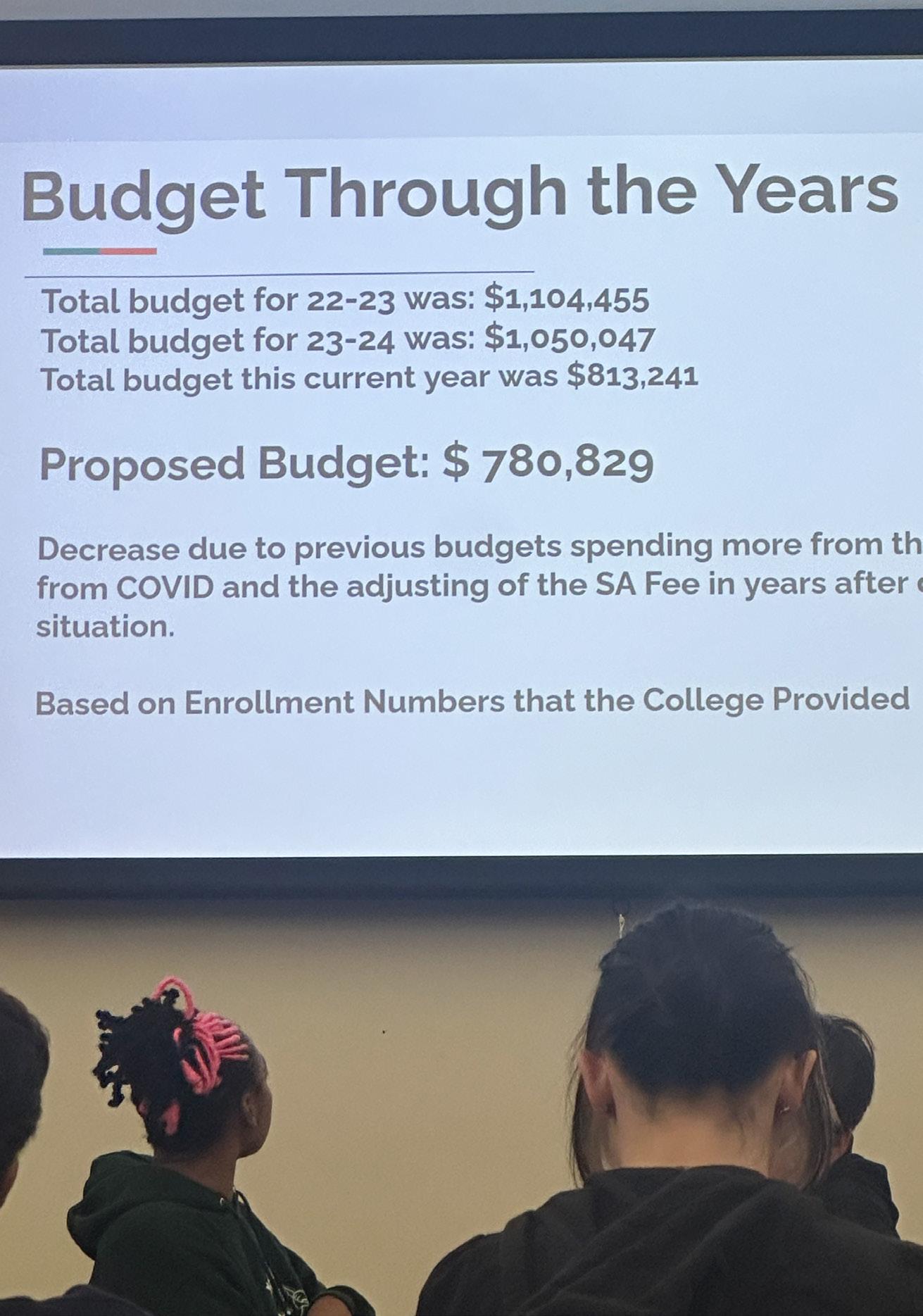 The total budget for 2022-2023 was $1,104,455. The total budget for 2023-2024 was $1,050,047. This past year the budget was $813,241. The proposed budget for 2025-2026 year is at $780,829. This is about a 29% decrease from 2022-2023. The decrease is due to the previous budgets relying more from the cash from the COVID-19 reserves and the adjustment of the student association fee over past years.