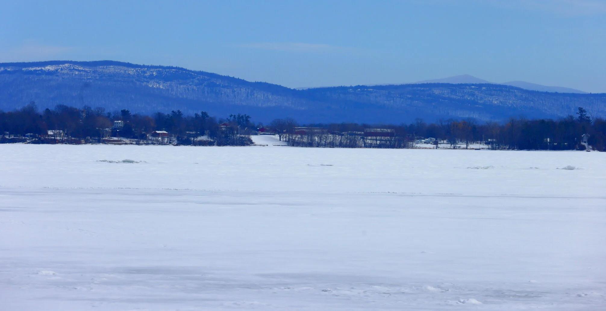 Looking from Moriah’s Bulwagga Bay to the Vermont shore, Lake Champlain’s surface has frozen totally this year. No ice fishermen have been seen recently due to low temperatures and thin ice.