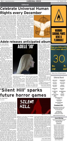 in 1999. In-game graphics are blocky, but not awful. Objects are static for the most part, and characters like Harry look like a modeling dummy with clothes on. The cutscenes on the other hand were incredibly ahead of their time for 1999. They look like something that could possibly be produced for the PlayStation 2 or a very early PlayStation 3 game. “Silent Hill” is incredibly story based, so nice cutscenes add to the game greatly. “Silent Hill” is easily one of the most successful horror games of all time. The success spawned a vast amount of sequels and multiple live action movies. The game has influenced many developers to come up with their own competition for “Silent Hill.” The Konami development team knows how to create a cursed legend that has been horrifying players since its dawn. Email JONAS WARD cp@cardinalpointsonline.com