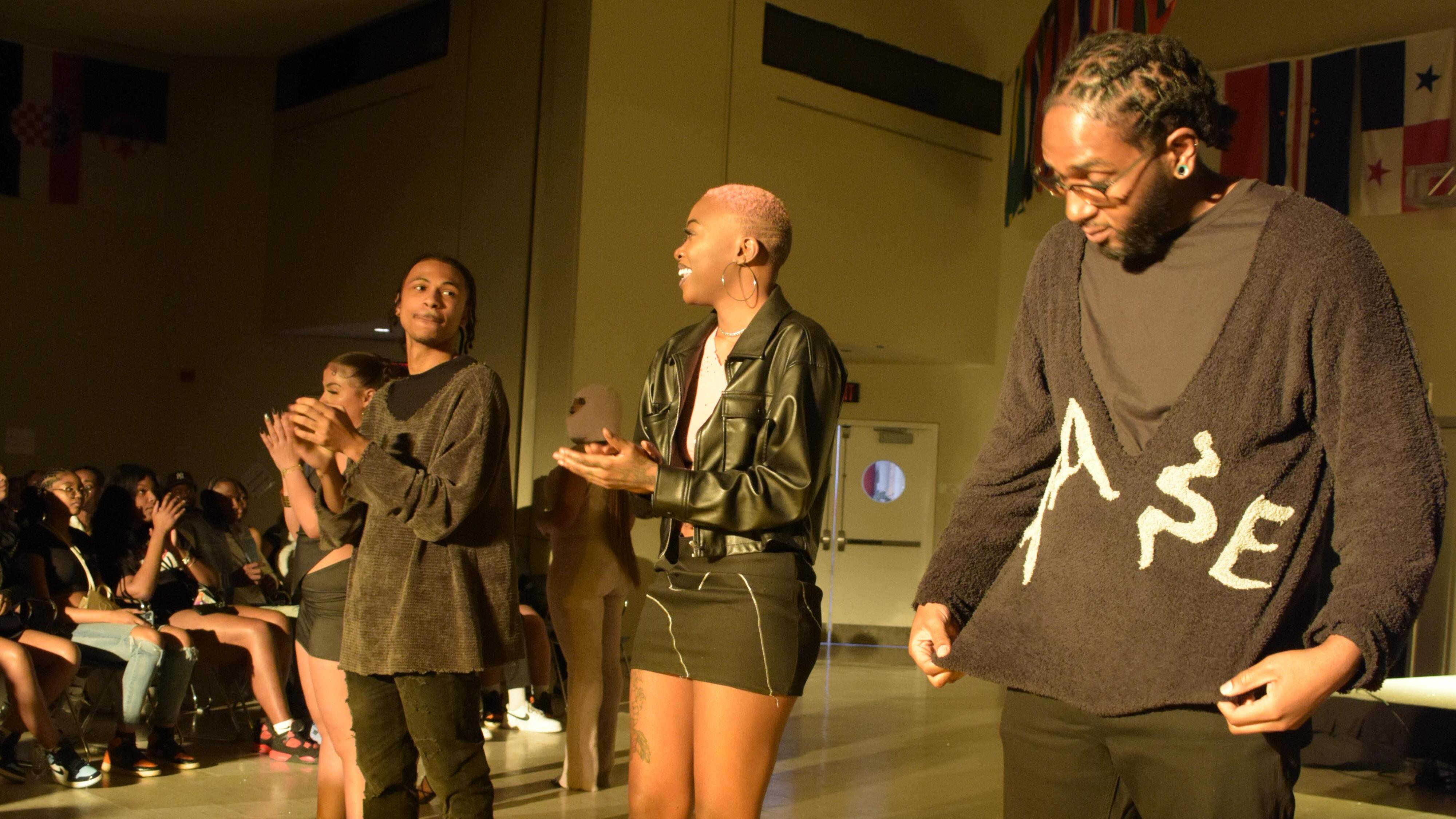 Below, models clap for the designer of Kase Klothed, Kiala Rose (center), before she gives her speech of appreciation for H.O.D for allowing her to see her material on the runway.