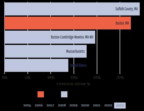 The following chart shows the percentage of foreign-born residents in Boston, MA compared to that of it’s neighboring and parent geographies.