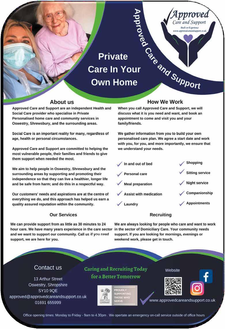 All the listings in this publication of care homes, care homes with nursing and home care providers are supplied by the Care Quality Commission (CQC) and neither Shropshire Council nor Care Choices can be held liable for any errors or omissions. The information contained in this Support Finder was correct at the time of going to print. The inclusion of advertisements for homes and agencies in this Support Finder does not act as an endorsement or recommendation by Shropshire Council.