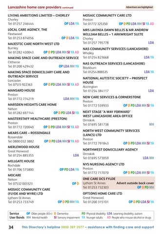 MARSDEN HEIGHTS CARE HOME Nelson Tel: 01282 697144 OP D PD LDA SI YA MASTERSTAFF HEALTHCARE (PRESTON) Preston Tel: 01772 720040 OP D PD LDA MH SI YA AD MEARS CARE – ROSSENDALE Rossendale Tel: 0800 032 3882 OP D PD LDA MH SI YA AD MERLEWOOD HOUSE Great Harwood Tel: 01254 885355 MILLGATE HOUSE Rochdale Tel: 01706 515800 MOCARE Nelson Tel: 07532 003323 MOSAIC COMMUNITY CARE (FLYDE AND WYRE) LTD Lytham St Annes Tel: 01253 733749