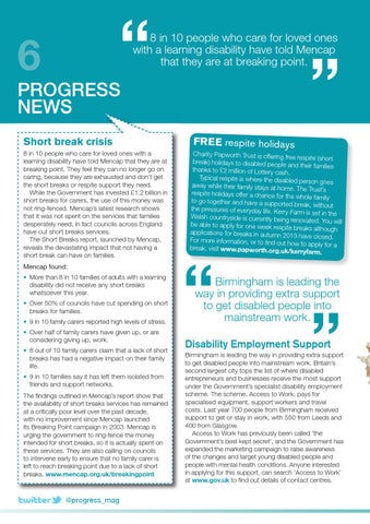 progress news Short break crisis 8 in 10 people who care for loved ones with a learning disability have told Mencap that they are at breaking point. They feel they can no longer go on caring, because they are exhausted and don’t get the short breaks or respite support they need. While the Government has invested £1.2 billion in short breaks for carers, the use of this money was not ring-fenced. Mencap’s latest research shows that it was not spent on the services that families desperately need, in fact councils across England have cut short breaks services. The Short Breaks report, launched by Mencap, reveals the devastating impact that not having a short break can have on families.