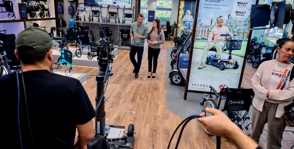 Our Brand team recently scripted and filmed an exciting new video to show off what our customers can expect in a CareCo showroom. Filmed in our brand-new, modern Stevenage showrooms, this video is there to show our customers what makes our showrooms so special and unique. Our two wonderful presenters, Adele and Jamie, were essential to showing our customers that mobility doesn’t have to conform to the usual stereotypes.