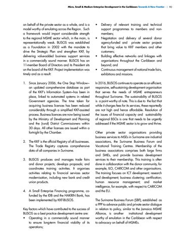 2. The KKF is the official Registry of all businesses. The Trade Registry captures comprehensive data of all companies in Suriname. 3. BUSOS produces and manages trade fairs and donor projects; develops proposals; and coordinates training activities. It organises activities relating to financial services sector modernisation, including new bank and credit union products. 4. A Small Enterprise Financing programme, cofunded by the IDB and the HAKRIN Bank, has been implemented by KKF-BUSOS. Key factors which have contributed to the success of BUSOS as a best practice development centre are: • Operating in a commercially sound manner to ensure long-term financial viability of its operations;