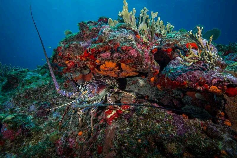 The Caribbean Spiny Lobster is a nocturnal crustacean. They vacate their old shells while simultaneously absorbing water , expanding their body size. At night, they move away from the cravices and holes in coral reefs to feed on a wide variety of marine invertebrates. They grow by molting.