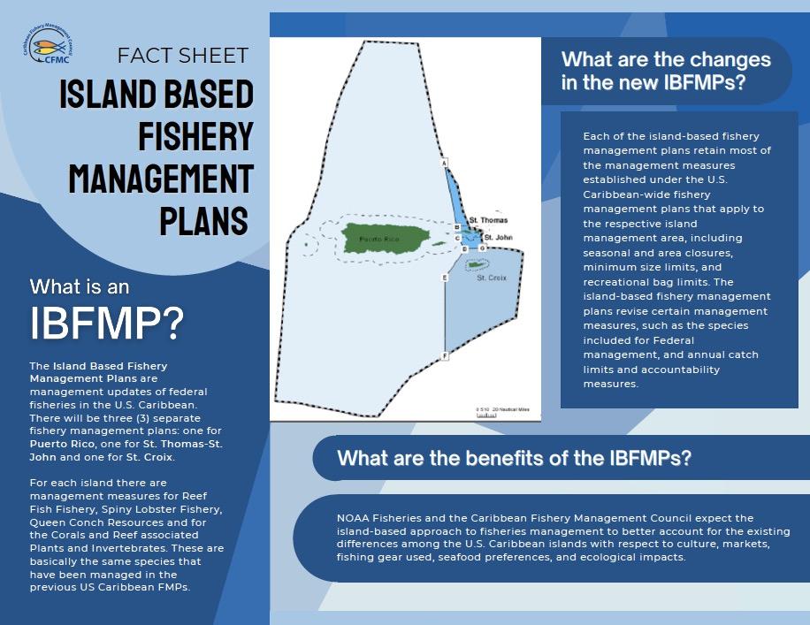 • Island Based Fishery Management Plans (IBFMP) for Puerto Rico, St. Thomas/St. John and St. Croix. The objective is for fishers and consumers to recognize the species being managed, their natural function in the marine ecosystem and the importance of management measures to keep the ecosystem healthy and the fishery resources sustainable.