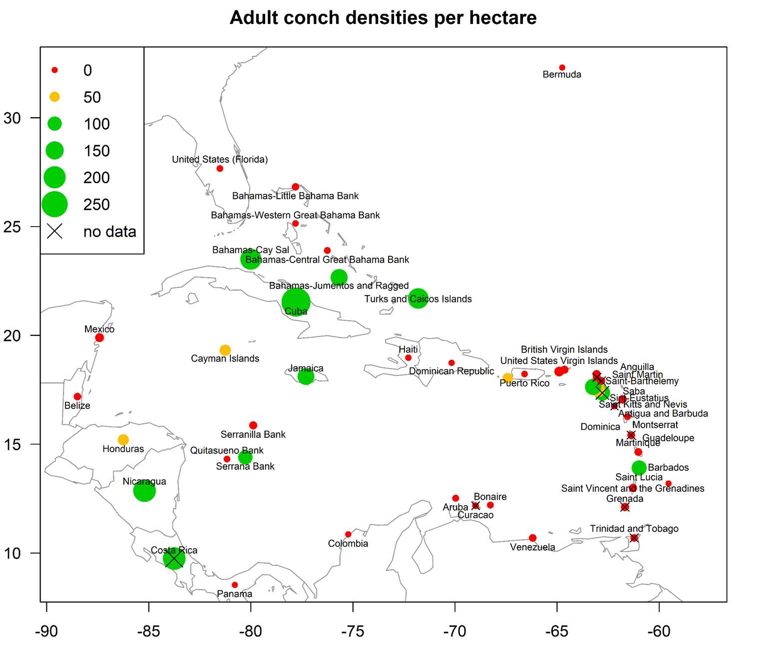 Estimated adult conch densities. Countries without density data and relying on borrowed values are indicated with an X. Where densities are summarized on a country level, the points appear at the approximate center point of the country; where densities are summarized on a subregional level the points appear at the location of fishing banks or subregions.
