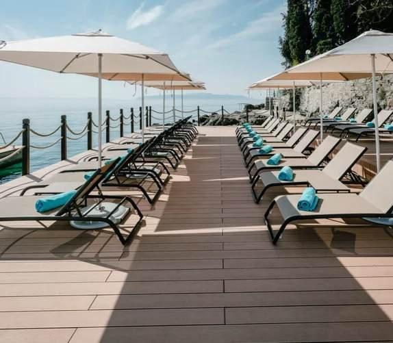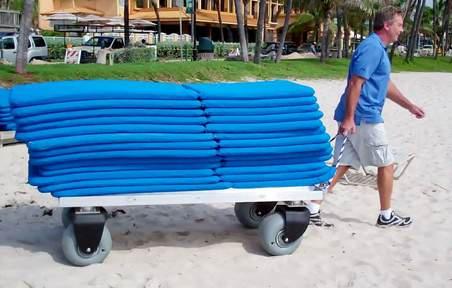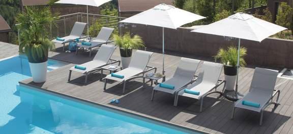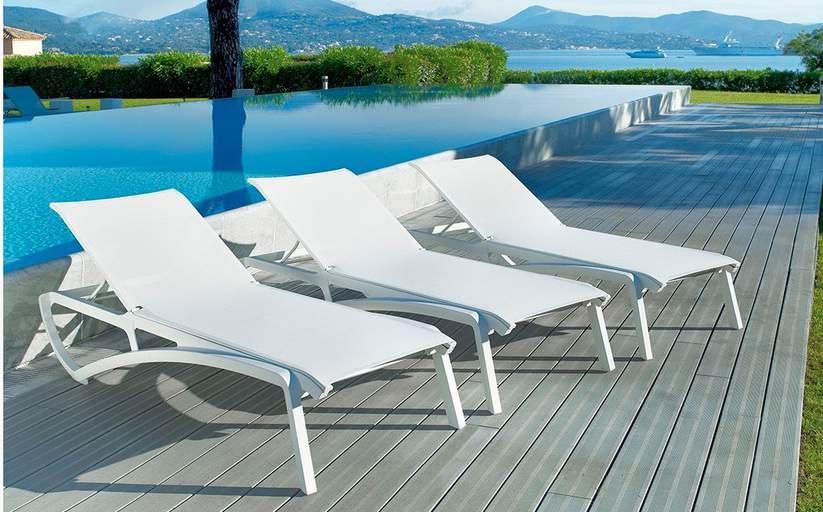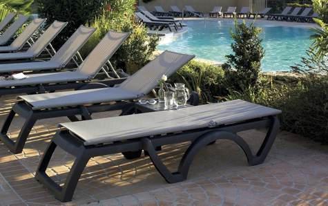 • • • Versatile lounger for pool decks, balconies, or beach.
