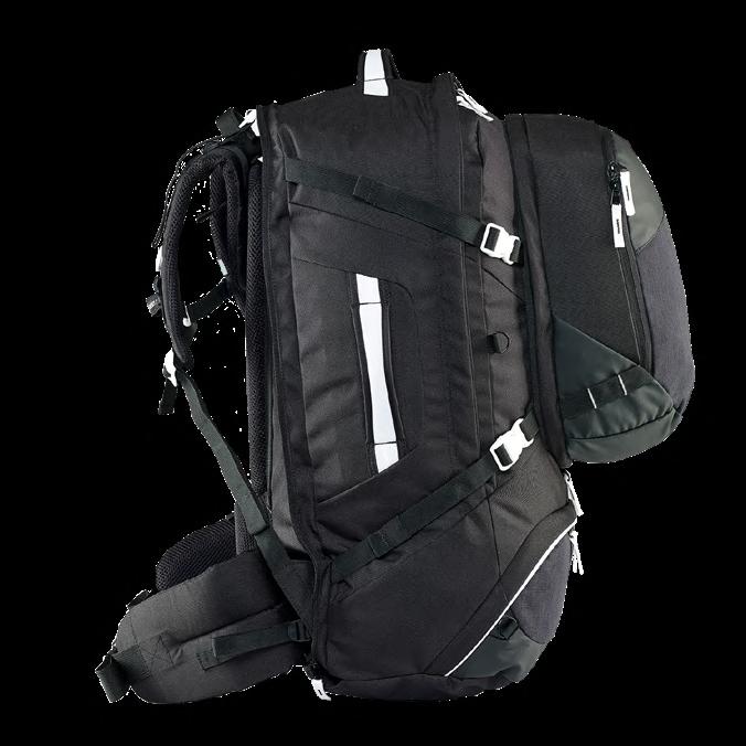 70L & 80L Concealable harness system Premium aluminium trolley system Compression straps Zip off daypack Base shoe compartment Lockable zip housings