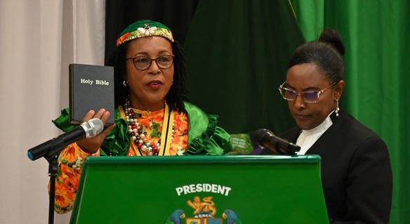Dominica’s first woman head of state, Sylvanie Burton, was sworn into office on Monday promising to serve all members of the population as the island moves forward in an uncertain global environment.