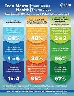 This poll was conducted by Ipsos on behalf of NAMI between July 15–Aug. 1, 2022, using the KnowledgePanel®. It is based on a representative sample of 1,015 U.S. teens (ages 12–17) recruited through their parents. The margin of sampling error is plus or minus 3.5 percentage points at the 95% confidence level.