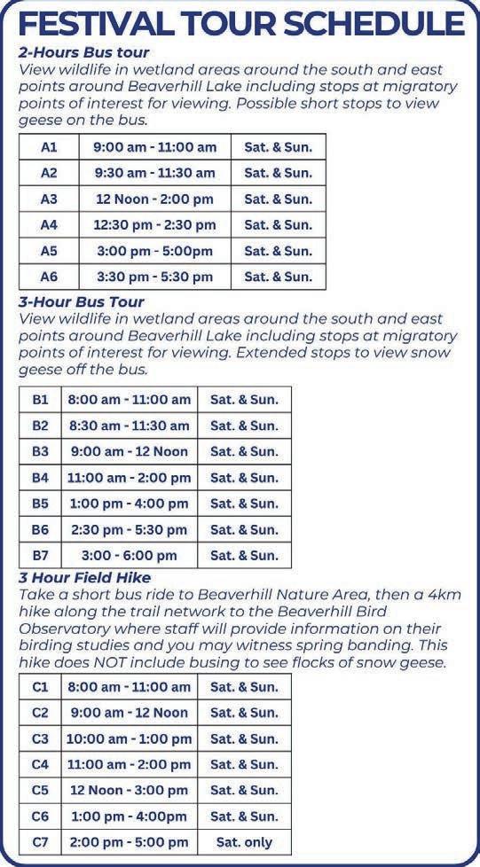 A committee of 11 organizations has been meeting regularly to repeat the successful festival held in April 2023 and 2024. Last year over 1,500 people took bus tours to see the migrating snow geese and other birds, and enjoyed hikes in the Beaverhill Natural Area to the Beaverhill Bird Observatory to watch migrant songbirds being banded.