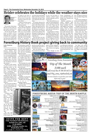the tremendous number of hours put in by their volunteer team, the committee now has about $26,000 to share with the community and with the Forestburg Historical Society. “We decided to give back to the wider community as we wouldn’t have had a book without all the stories submitted by community members.” The committee has made the following financial contributions to local organizations and funds: •$1,000 split between the Forestburg Golf Club and the Forestburg Curling Club (for using their building for storage and for the sales of the book;) •$10,000 to the Big Knife Villa Handivan Project; •$2,000 to the Forestburg S c h o o l Breakfast Program; •$4,000 to the Forestburg Community Hall. They will be giving $8,000