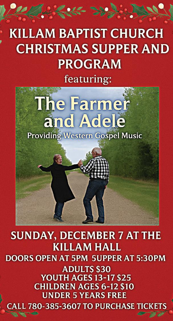 Christmas Supper and Program, Sunday, December 7th at the Killam Community Hall. Doors open at 5pm, Supper at 5:30pm. Special guests "The Farmer and Adele" will bring a program of Western Gospel music. All ages welcome. For tickets, please call the church 780-385-3607