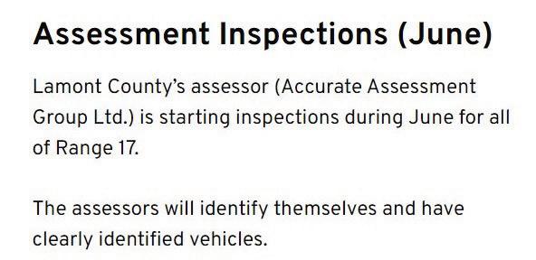 Tax notices have been sent to ratepayers by mail. If you have not received your notice, contact Lamont County’s Tax Clerk at 780-8552233. Payment to avoid penalty is June 30.