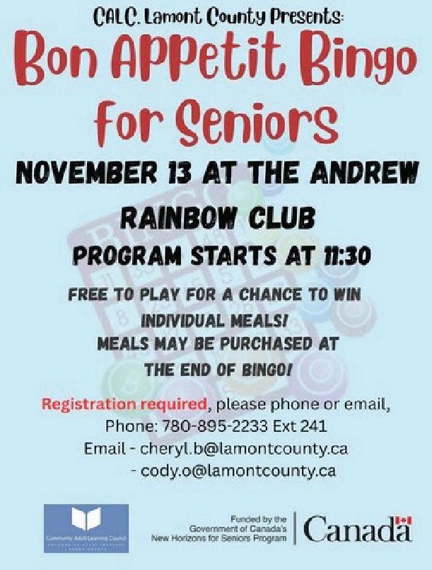 CALC: Bon Appetit Bingo for Seniors (in Andrew): Nov. 13 and 27. Registration required. CALC: Canadian Firearms Safety Course (Non-Restricted) – Nov. 29. Register with Dan - 825-439-5208. Cost is $140 for ages 12+.
