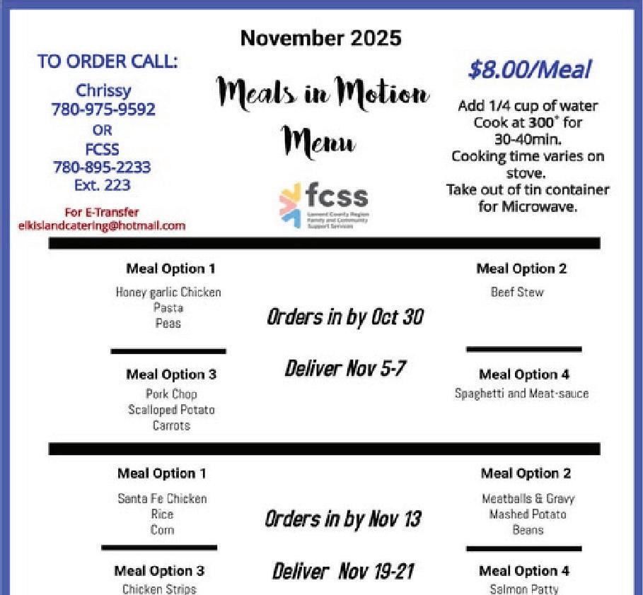 FCSS: Fitness Fun for Older Adults (Oct. 16 to Dec. 4) – email michelle.a@lamontcounty.ca for info. Meals in Motion: Nov. menu posted (lamontcounty.ca/community-programming). Seniors’ Coffee: 10-11 a.m. (Wed.) in Andrew, & (Thurs.) & Mundare. Join FCSS for coffee, conversation, snacks, & assistance with senior-related supports. Sr. Coffee is also held in St. Michael (Thurs.) from 10 a.m. to noon.