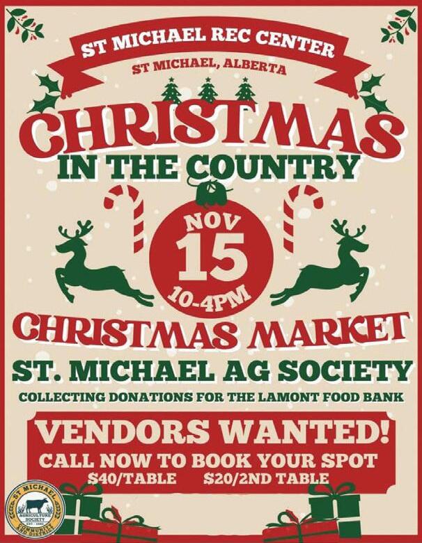ASB’s annual Photo Contest: Submit photos at lamontcounty.ca/photo-contest (Deadline to submit is November 21). See lamontcounty.ca/news for news posts/updates, including road closures and important updates. Do you have a business within Lamont County and want to be included in the digital Business Directory? Complete your free application at lamontcountynow.ca/business-directory. Local businesses operating within Lamont County, including those with a Lamont County Business License, are added to the directory once approved. If you have any questions, contact Economic Development at 780-895-2233. You can also purchase a Business License for Lamont County (by Jan 31 for 2026) - lamontcounty.ca/departments/planning-development/business-licence Winter is here. Reminder: Don’t Push Snow Piles Across Roads or Entranceways. Residents are reminded when plowing snow out of your driveway, please do not push the snow onto the public road or across the road into the ditch. Pushing snow across the road creates packed areas and slippery patches that are difficult to remove and can be dangerous to road traffic. Push snow to the right side of your driveway to ensure it does not get pushed back when the local road is plowed. All flag purchases or signup for Medically Fragile or Seniors service (for private snow removal), must be completed at the Public Works/Ag Services Building553004A Hwy 831 (not at the Admin. Building). Please complete this ASAP. The County of Lamont Food Bank is accepting Christmas Hamper requests from Nov. 12 to Dec. 8. Please call (780) 619-6955 and leave a message to request a hamper. Hampers will be delivered Sunday, December 21. St. Michael Community and District Ag. Society – Christmas in the County Craft Sale & Market at St. Michael Hall on November 15 from 10 a.m. to 4 p.m.